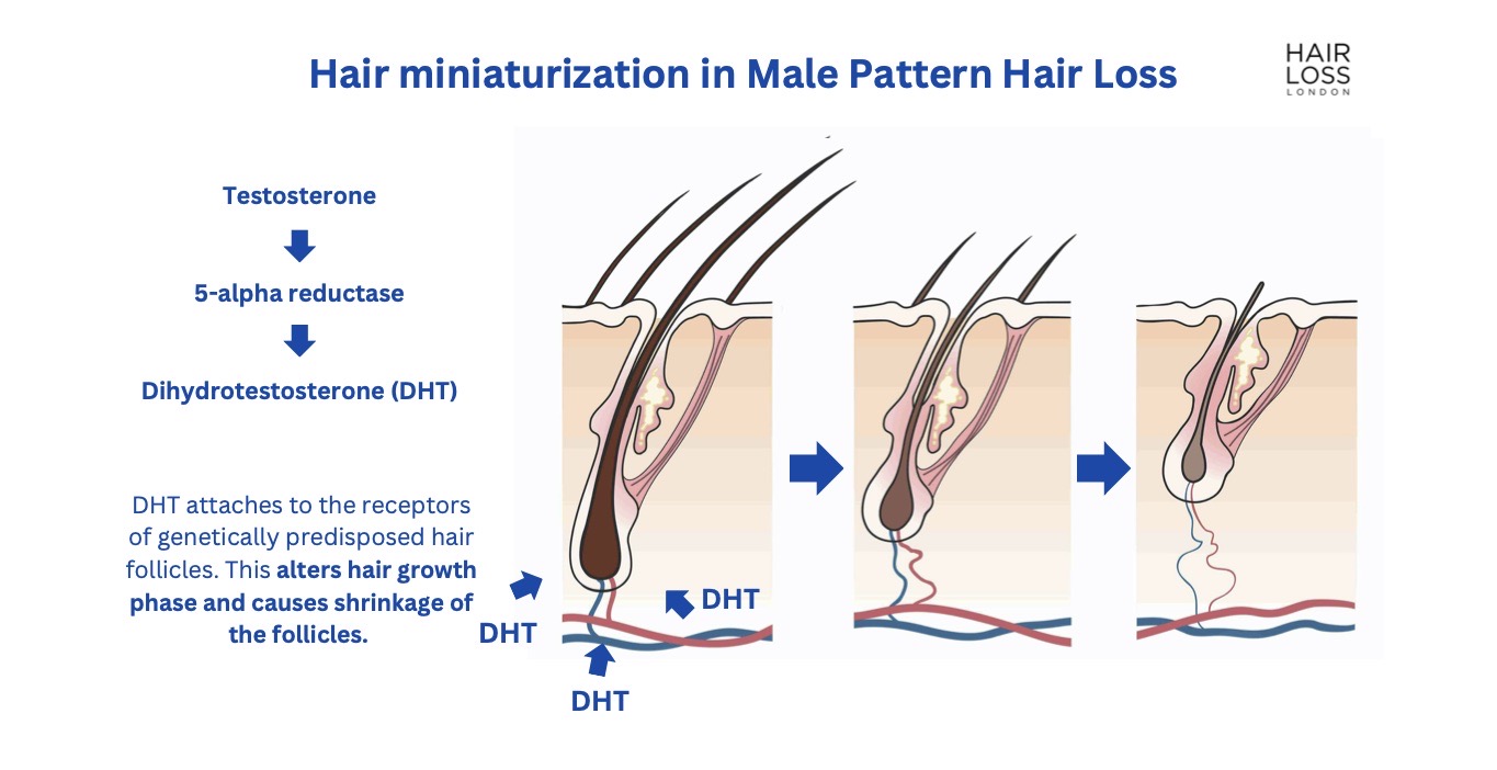 Androgens also will shorten the anagen (active hair growth) phase in genetically predisposed men. These factors combine to give a progressive patterned hair loss that is easy to identify. Patterns can vary between ethnicities but the areas affected are common to all ethnicities.